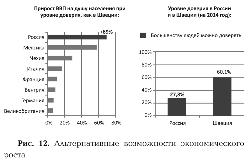 В контексте тех факторов и обстоятельств, о которых я рассказываю, есть альтернативный вариант экономического роста, и я, собственно, с этого начинал разговор, когда в первой главе привел пример количественного расчета самого мощного влияния культуры на экономику. Речь шла именно о возможности экономического роста, причем именно для России. Напомню: в 2010 году вышла коллективная статья известных французских экономистов (Я. Алгана, П. Каю и др.), где был произведен расчет того, как положительный ответ на вопрос «Можно ли доверять большинству людей?» влияет на валовый продукт на душу населения. Авторы делают вывод, что если бы в современной России уровень доверия был такой, как в современной Швеции (то есть 60 % респондентов положительно отвечали бы на вопрос, что большинству людей можно доверять), то валовый продукт на душу населения был бы на 69 % больше – то есть более чем в полтора раза эффективнее была бы российская экономика! Вариант очень соблазнительный, и хотелось бы к нему перейти. Почему «хотелось бы», почему не устраивают низкие темпы роста, о которых говорят мои коллеги в докладе «Застой-2»?