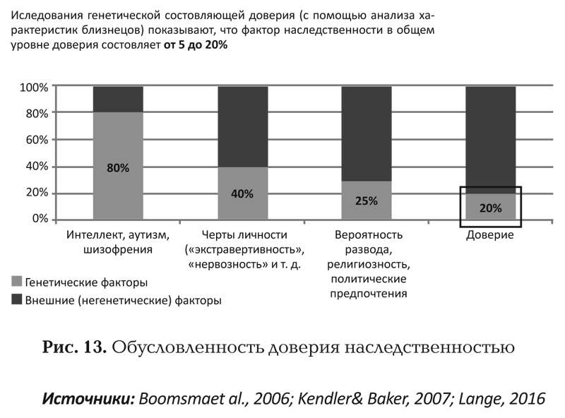 Давайте начнем с геномики, потому что изменяемость того или иного свойства мы теперь можем исследовать самыми разными способами. Исследования генетической составляющей доверия с помощью анализа характеристик близнецов показывают, что фактор наследственности в общем уровне доверия составляет от 5 до 20 %. Это очень мало, потому что интеллект, например, наряду с аутизмом и шизофренией, – на 80 % наследуемое свойство. (Что меня как человека, занятого образованием, настораживает и пугает. Я начинаю думать: чем мы занимаемся в сфере образования? Мы просто отбираем тех, у кого наследственно определенный интеллект, или мы все-таки меняем генетическую предрасположенность и позволяем подняться тем, у кого такой предрасположенности нет?) Черты личности, такие как экстравертивность, например, на 40 % наследуются. Политические и религиозные взгляды, согласно этому анализу – на 25 % наследуемые свойства. А у фактора доверия обусловленность наследственностью – всего от 5 до 20 %.