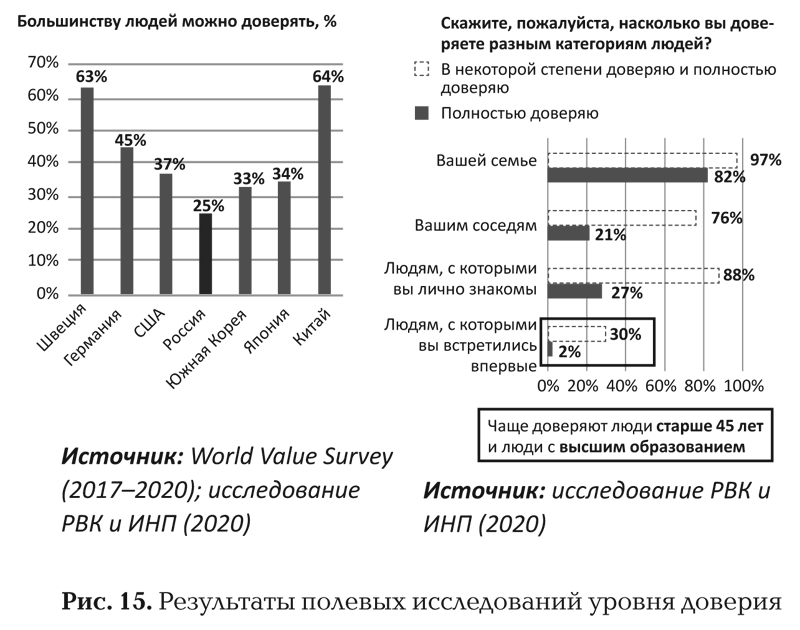 Сейчас в России доверие примерно в два раза ниже, чем в Швеции, которая выступает как эталон. У нас 25 % респондентов положительно отвечают на вопрос о том, можно ли доверять большинству людей. В основном это жители мегаполисов, потому что трудно общаться с большим количеством незнакомых людей, исходя из предпосылки, что все тебя могут обмануть, – в мегаполисе построить жизнь на недоверии нельзя. По уровню доверия мы проигрываем и восточным, и западным нашим конкурентам: более высоким уровнем доверия обладают не только шведы, но и США, Германия, Южная Корея, Япония, Китай (хотя в Японии и Китае структура доверия отличается, она связана с большим доверием в родственных кругах).