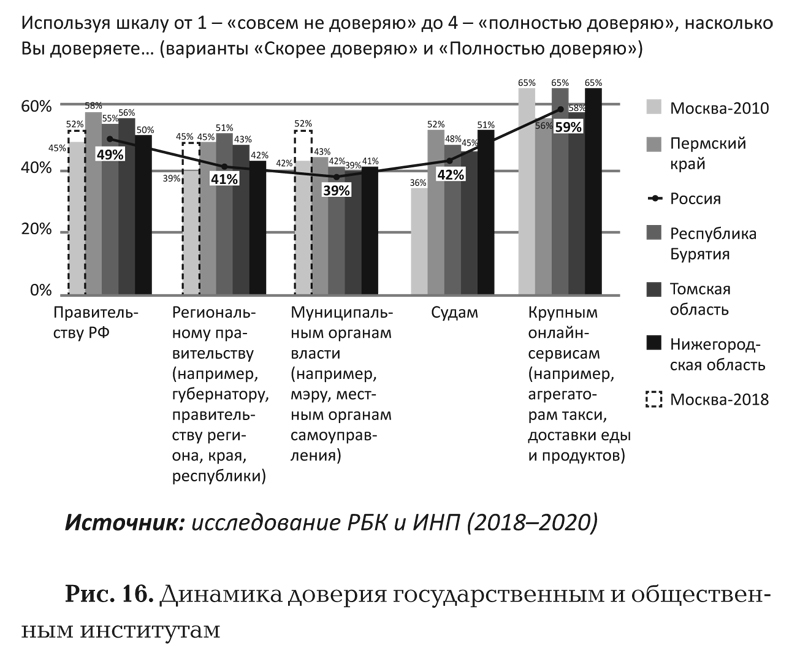 Мы понимаем, что объемы доверия колеблются. Например, в конце 80-х годов ХХ века, когда началось измерение уровня доверия в СССР, у нас был очень высокий показатель взаимного доверия. Это легко заметить и по внешним признакам: в центре столицы собирались протестные митинги по полмиллиона человек, которые не знали друг друга, но считали единомышленниками – это, конечно, демонстрация высокого взаимного доверия. Позже оно сгорело в ходе тяжелых реформ, распада прежних социальных общностей, и начало медленно расти после летних пожаров 2010 года.