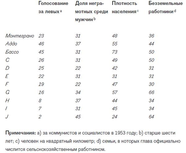 Электорального поведения жителей Монтеграно приведенные в начале главы версии тоже не объясняют. Часто приходится слышать, что за коммунистов больше голосуют там, где выше демографическая нагрузка на природные ресурсы (то есть где безысходней и распространенней хроническая нищета), ниже уровень образования (в особенности там, где больше неграмотных) и больше процент безземельных работников. Но, судя по данным о Монтеграно и окрестностях, эти факторы никак не сказываются на числе голосующих за коммунистов. Как мы видим в таблице 2, неграмотность выше всего в коммуне, где коммунисты в 1953 году получили меньше всего голосов; там, где популярнее всего коммунисты, плотность населения лишь незначительно выше средней; а доля наемных сельскохозяйственных работников наиболее высока в самых консервативных коммунах.