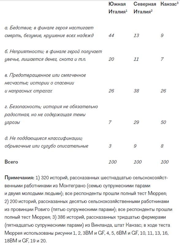 Обычные люди, принадлежащие к другой культуре, при прохождении теста не выказывают такой поглощенности темой не счастий. В таблице 3 ответы крестьян из Монтеграно сравниваются с тем, как отвечали на задания того же теста сельскохозяйственные работники из провинции Ровиго и фермеры из штата Канзас. Все 16 жителей Монтеграно рассказывали истории, заканчивающиеся бедствием, – в среднем по 8,7 такой истории каждый. Из 10 северян 9 человек рассказали в среднем по 2,9 такой истории. Из 30 сельских жителей Канзаса только у 19 человек рассказы иногда заканчивались бедствиями, причем на каждого из них приходится по 1,5 рассказа с таким концом.