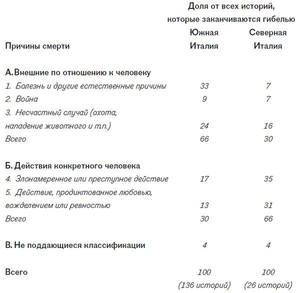 Как видно из таблицы 4, крестьянин из Монтеграно больше боится природы, чем человека. В нем особенно велик страх смерти по естественным причинам. Северяне рассказали так мало историй с катастрофическим концом, что таблица не позволяет сделать о них сколько-нибудь надежных выводов; однако, насколько можно судить, беды они склонны ждать скорее от человека, чем от природы.