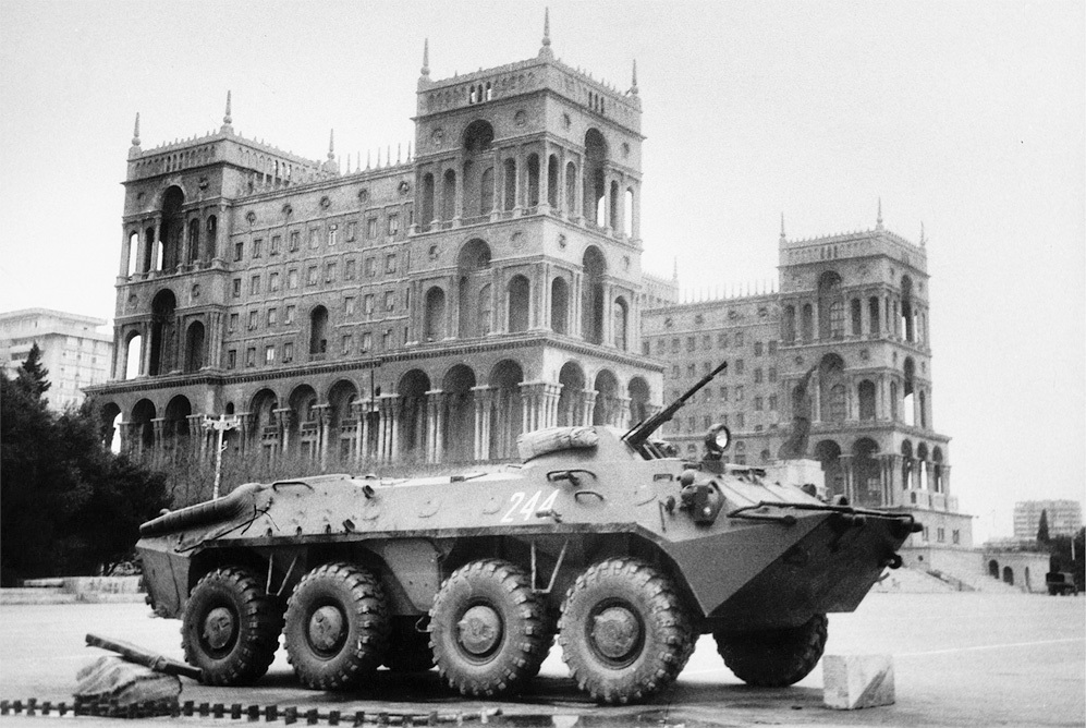 Советская техника на площади имени Ленина в Баку (сейчас площадь Свободы, или площадь Азадлыг) во время событий «Черного января» 1990 года. Союзный центр силами Советской армии пытался подавить выступления оппозиции. Более сотни мирных жителей погибли