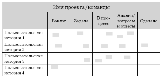 Один из главных способов сделать работу более продуктивной – визуализировать ее при помощи ряда техник наподобие Scrum-доски. Визуализируя процесс, вы создаете больше возможностей для обсуждения рабочего процесса, его продвижения и ускорения. Scrum-доска обобщает работу команды: по мере выполнения заданий листочки с их обозначением передвигаются по соответствующим колонкам. Перемещения отражают ход работы во время спринта. Таблица 3.1 представляет пример Scrum-доски, на которой отражено несколько пользовательских историй с описаниями деталей к каждому из заданий. Настоящая доска используется, когда команда располагается в одном месте, а в случае, когда члены команды разбросаны по разным местам, используются аналогичные программные решения.