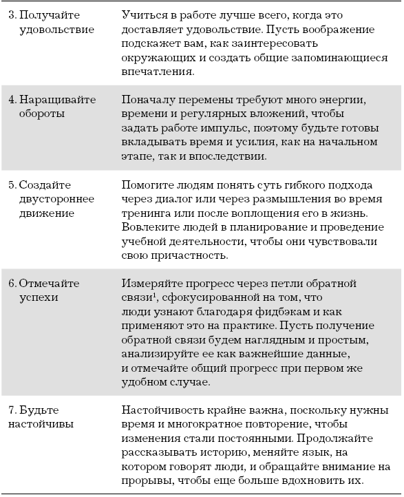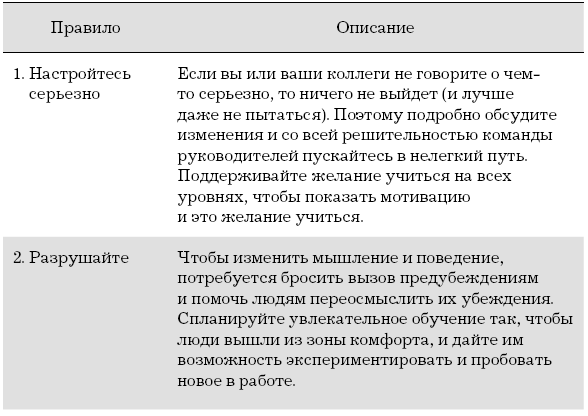 Мой опыт говорит о том, что существует несколько простых правил, которые помогут добиться успеха и развивать необходимые навыки и модели поведения в больших группах людей (см. Таблицу 9.1). Работа должна сопровождаться Scrum-мастером или другим наставником того же рода, который обучает Agile-команды так, чтобы они могли на ежедневной основе воплощать принципы Agile на практике, постепенно повышая скорость работы и приносить выгоду.
