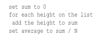 А что, если мы захотим вычислить средний рост? Можно узнавать у каждого человека его или ее рост, складывать получаемые значения по мере их поступления (возможно, используя программу Игрушки для суммирования последовательности чисел) и потом разделить итог на количество опрошенных. Если у нас на листочке записано N значений роста, то, выразив процесс расчета более «алгоритмически», мы получим:
