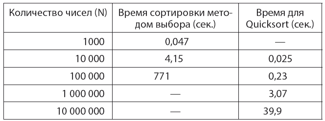 В качестве эксперимента я сгенерировал 10 миллионов случайных 9-значных чисел, аналогичных номерам социального страхования США, и замерил время, которое заняла сортировка групп разного размера с помощью метода выбора (зависимость N2, или квадратичная) и алгоритма Quicksort (зависимость Nlog N). Результаты представлены на рис. 4.2. Прочерк в таблице означает, что я опускал эти вычисления.