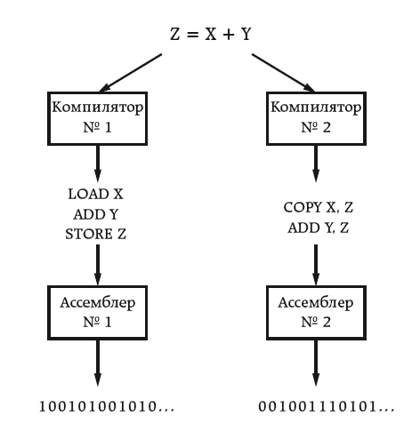 Схема данного процесса приведена на рис. 5.1, где показано, что одинаковые входные выражения, проходя через две разные компилирующие программы и соответствующие ассемблеры, преобразуются в две различные последовательности инструкций.