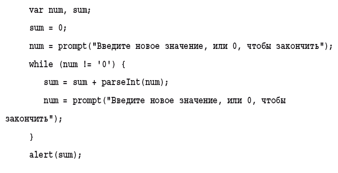 Я покажу одну и ту же программу, написанную на шести наиболее важных языках программирования высокого уровня – Fortran, С, C++, Java, JavaScript и Python, – чтобы вы в общих чертах уяснили их сходства и различия. Каждая из них выполняет то же самое, что и программа для компьютера-игрушки в главе 3. Она складывает целые числа, а когда появляется нулевое значение, выводит сумму и останавливается. Все программы имеют одинаковую структуру: они дают названия используемым величинам, присваивают нулевое начальное значение для суммы, считывают числа и суммируют их, пока не будет введен ноль, затем выводят полученную сумму. Не беспокойтесь о деталях синтаксиса: примеры в основном нужны для того, чтобы вы получили представление, как выглядят языки. Я старался, чтобы образцы программ как можно больше походили друг на друга, хотя, возможно, есть и более удачные способы написать любую из них в отдельности.