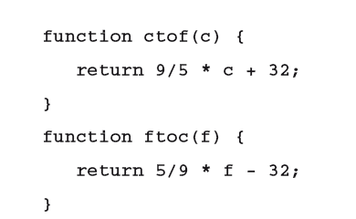 В качестве примера с выдуманной ситуацией на рис. 5.9 показана пара функций JavaScript, которые переводят температуру по Цельсию в градусы Фаренгейта и наоборот. (Операторы * и ⁄ выполняют умножение и деление соответственно.) Одна из этих функций выдает ошибку. Вы заметите ее? Я вернусь к ней через мгновение.