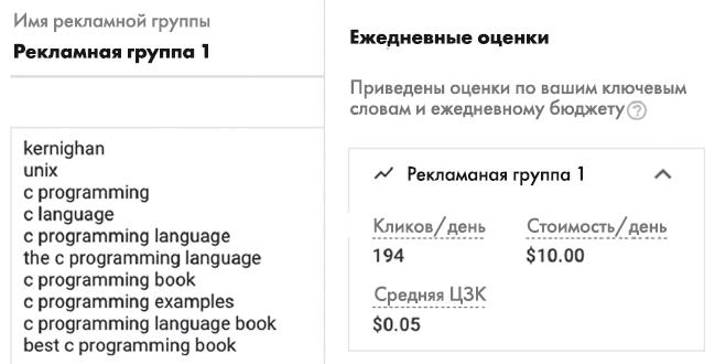 Google Ads (ранее AdWords) позволяет легко экспериментировать с предлагаемой рекламной кампанией. Например, их инструмент оценки (см. рис. 11.2) говорит, что ожидаемая стоимость поискового слова «керниган» и связанных с ним – например, unix и «программирование на С» – будет составлять 5 центов за клик, то есть каждый раз, когда кто-то ищет один из этих терминов и затем щелкает на мою рекламу, я буду платить Google 5 центов. Инструмент также подсчитал, что по выбранным мной поисковым запросам будет совершаться 194 клика в день при ежедневном бюджете в 10 долларов (в среднем за месяц) – хотя, конечно, никому неведомо, как много людей нажмут на мою рекламу и во сколько мне это обойдется. Я никогда не пытался проверить на опыте.