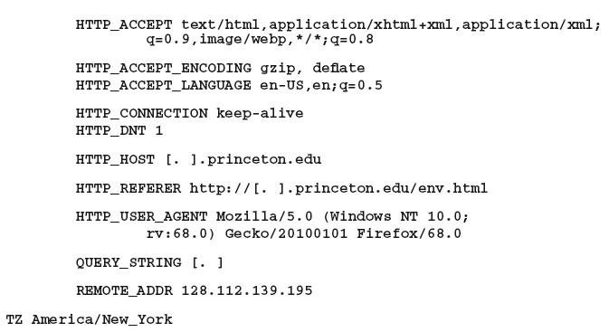 Как собирают сведения? Какие-то данные автоматически отправляются браузером при каждом запросе. Среди них IP-адрес, страница, которую вы просматривали (ссылающийся домен, или «реферер»), тип и версия вашего браузера («агент пользователя») и ОС, ваши языковые предпочтения. Вы можете ограниченно этим управлять. На рис. 11.3 показана некоторая отсылаемая информация, отредактированная для краткости.
