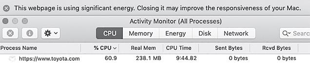 Страница продолжала отправлять сетевые запросы все время, пока я оставался на сайте, и вообще выполняла столько фоновых вычислений, что Safari предупредил меня об этом (рис. 11.4).
