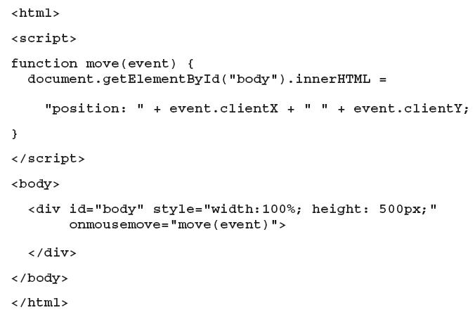 На рис. 11.6 показаны несколько строк кода JS, который отображает положение мышки при ее перемещении. Если добавить еще парочку, скрипт начнет передавать такую же информацию поставщику любой веб-страницы, просматриваемой вами. Туда же уйдут и сведения о других событиях – например, где вы печатаете, щелкаете или куда переносите блоки. Если хотите увидеть гораздо более отточенную и очень занимательную реализацию той же идеи, зайдите на сайт clickclickclick, click.