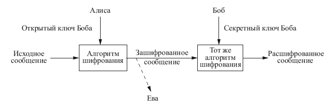 Предположим, что Алиса хочет отправить Бобу сообщение, зашифрованное так, чтобы только Боб мог его прочитать. Она переходит на веб-страницу Боба и берет его открытый ключ, которым затем кодирует свое послание. Когда она отсылает зашифрованное сообщение, соглядатай Ева может увидеть факт отправки, но, поскольку текст закодирован, она не сумеет прочесть его159.