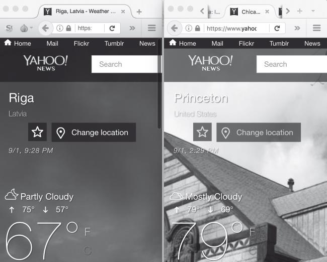 В качестве примера того, как выглядит анонимное посещение сайта для обычного пользователя, на рис. 13.4 показано отображение сайта с погодой в Принстоне в Тог (слева) и Firefox (справа). В обоих случаях я посетил . Yahoo считает, что знает мое местоположение, но он ошибается, если я захожу через Тог. Почти в каждом моем эксперименте выходной узел находился где-то в Европе. Когда я через час перезагрузил страницу, он переместился из Латвии в Люксембург. Единственное, что меня немного смущает, – температура всегда указывалась по шкале Фаренгейта, не слишком распространенной за пределами США. От чего зависит выбор Yahoo? Другие погодные сайты указывают температуру в градусах Цельсия.