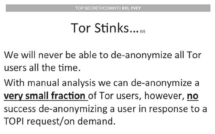 Защищен ли он от АНБ или настолько же влиятельных организаций? В число документов, обнародованных Сноуденом, вошла презентация для АНБ 2007 года, где на одном слайде (рис. 13.5) говорится: «Мы никогда не сможем деанонимизировать всех пользователей Тог за все время его существования»162. Конечно, АНБ не собирается сдаваться, но пока эта система кажется лучшим инструментом защиты частной жизни для обычных людей163. (Тут есть легкая ирония, поскольку изначально Тог разрабатывался государственным учреждением США – научно-исследовательской лабораторией ВМС, – стремившимся обеспечить безопасность линий связи американской разведки.)