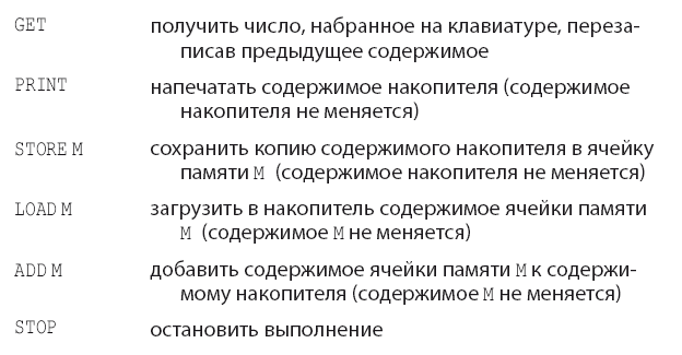 Я привык называть такую выдуманную машину «компьютером-игрушкой», или просто Игрушкой, поскольку она не настоящая, но обладает свойствами реальной. По возможностям она примерно соответствует уровню мини-ЭВМ конца 1960-х годов и напоминает устройство, описанное в первой статье Беркса, Голдстайна и фон Неймана. В компьютере-игрушке есть память, отведенная под инструкции и данные, а также одна дополнительная область хранения – накопитель, емкости которого достаточно для удержания одного числа. Накопитель – это аналог экрана на калькуляторе: он показывает число, только что введенное пользователем, или последние результаты вычислений. Компьютер-игрушка содержит около десяти инструкций для выполнения основных операций, описанных выше. На рис. 3.1 приведены первые шесть из данного набора.