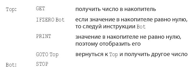 Давайте задействуем инструкцию IFZERO, чтобы написать программу (см. рис. 3.7), которая считывает и печатает входные значения до тех пор, пока в них не появится значение, равное 0. Она будет извлекать и отображать данные, пока пользователь не устанет и не введет ноль, после чего программа перейдет к инструкции STOP, помеченной как Bot, то есть bottom («низ»), и остановится. (Заманчиво написать IFZERO STOP, но так не сработает: за IFZERO должна следовать ячейка, а не инструкция.)