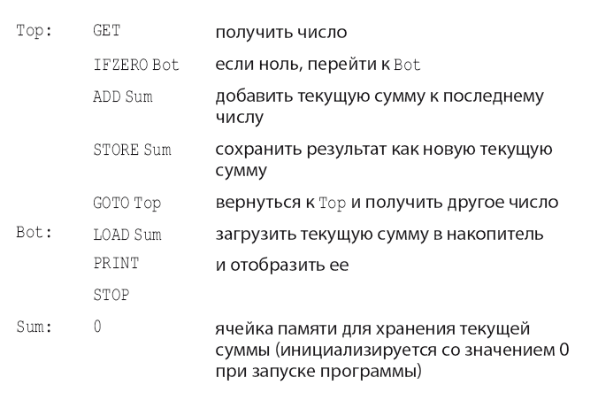 В качестве еще одного примера работы IFZERO и GOTO на рис. 3.8 приведена программа, которая суммирует несколько чисел и останавливается, когда введен 0. Какое-либо специальное значение сплошь и рядом применяют для того, чтобы завершить последовательность ввода. В данном случае ноль вполне подходит в качестве метки окончания, потому что мы складываем числа, а добавлять данные с нулевым значением не обязательно.