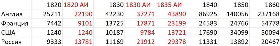 Единственное, что меня в нашем промышленном росте раздражало, это то, что англичане все равно успевали расти быстрее нас. За тот же период, что мы «выросли» на 9 миллионов пудов, островитяне «выросли» на 12 и довели суммарный объем выплавки чугуна на острове до невероятных 42 миллионов пудов в год. Вот как за ними угнаться? С другой стороны у них на подготовку своего рывка ушел весь 18 век целиком, пока Российская империя занималась войнами, дворцовыми переворотами и прочими очень интересными, но малоконструктивными вещами. Посмотрим на эту же статистику лет через 20, глядишь для островитян она станет куда менее мажорной.