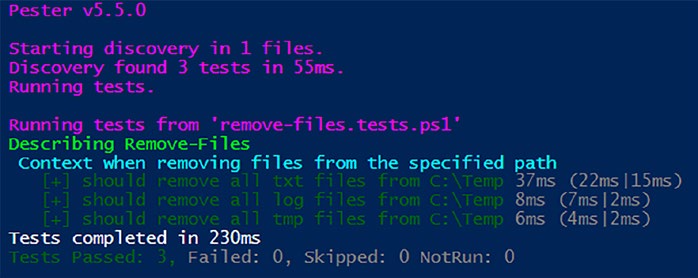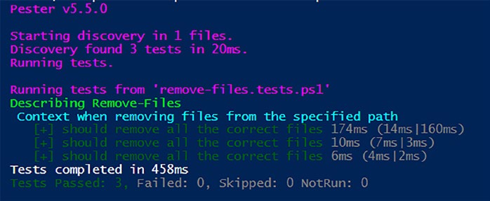 as a variable in the test code. For instance, $filetype and $path used as parameters when calling the function Remove-Files represent the keys “filetype” and “path” in the hashtable, dynamically adapting to the associated values during each test execution. The test is run three times, once for each hashtable.