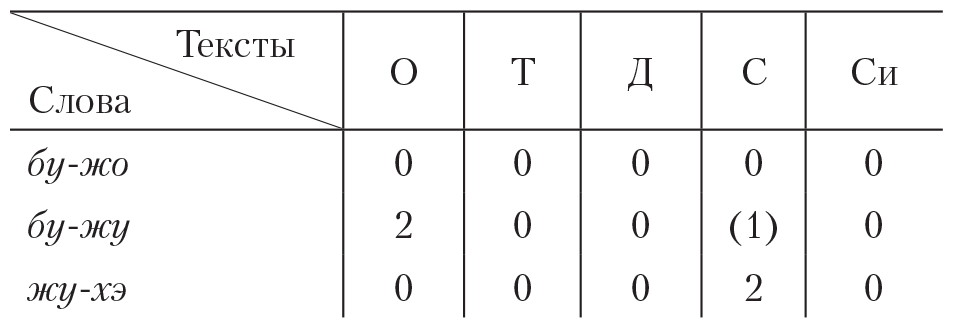 Мною были рассмотрены: 1) основной текст «Книги Перемен» (О), 2) «Туань-чжуань» (Т), 3) «Да сян-чжуань» (Д), 4) «Сяо сян-чжуань» (С) и 5) «Сицы-чжуань» (Си) со стороны следующих слов: жо, жу и жань.
