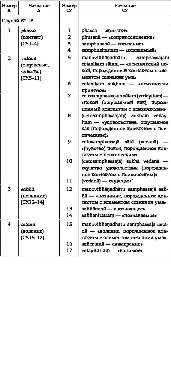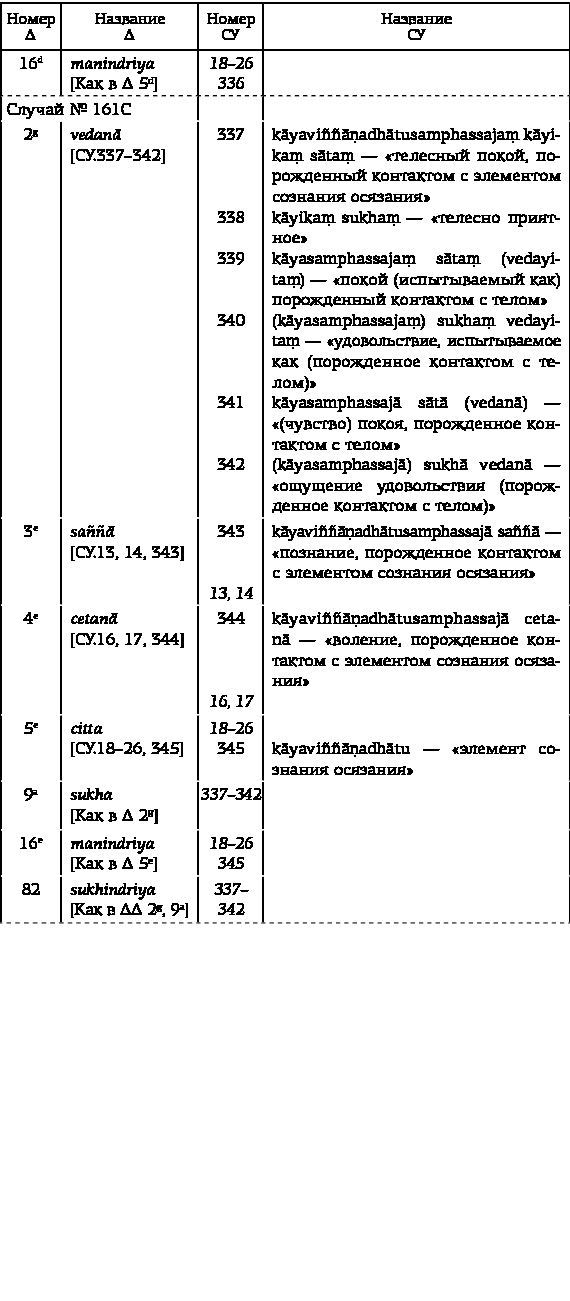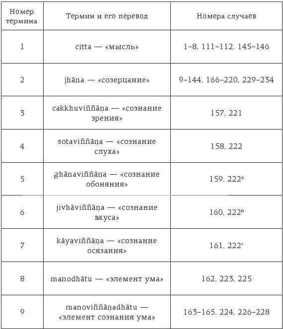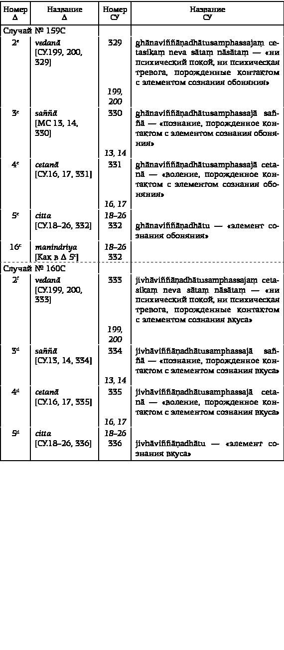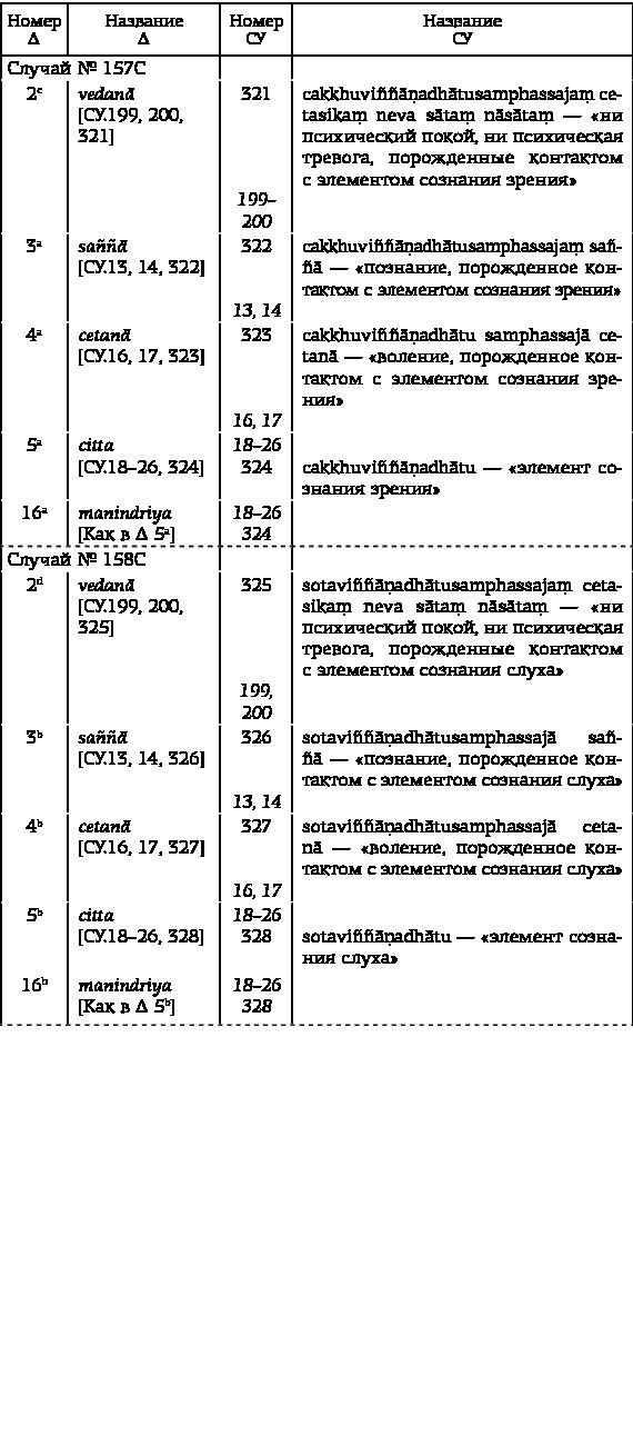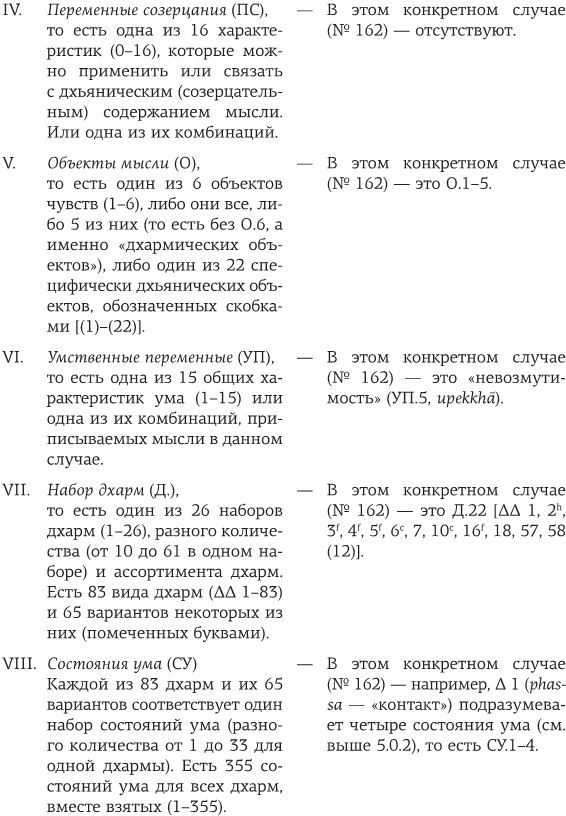 Переходя теперь к классу неопределенных дхарм (dhammā abyākatā), мы видим, как в уменьшенных наборах дхарм (ДД.17–26) семь вариантов дхармы мысли (ΔΔ 5a–5f и отдельно Δ 5) в своих соответственных группах состояний ума содержат термины М.3–9 номенклатуры мысли точно таким же образом, как мы видели в случае читты выше: «элемент сознания зрения» (cakkhuviññāṇadhātu) выступает как субъект возникновения мысли (М.3) и как особое состояние ума [Δ 5a (и Δ 16a); СУ.324]; «элемент сознания слуха» (sotaviññāṇadhātu, М.4) выступает в Δ 5b и Δ 16b как СУ.328; «элемент сознания обоняния» (ghānaviññāṇadhātu, М.5) – в Δ 5c (и Δ 16c) как СУ.332, и т. д.