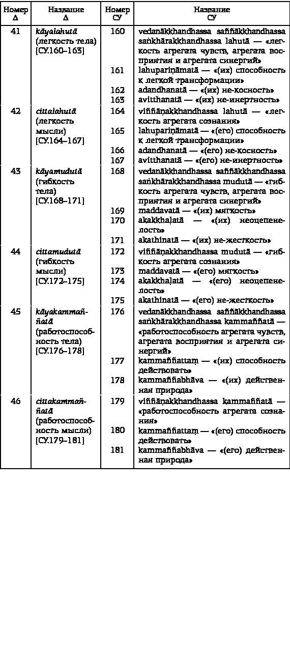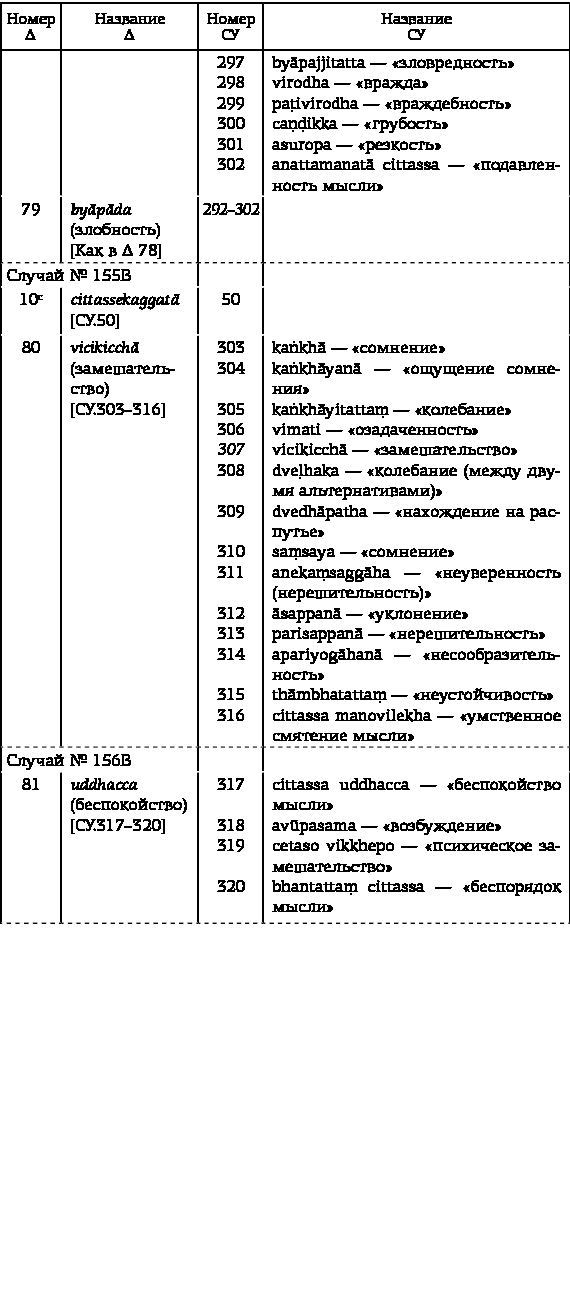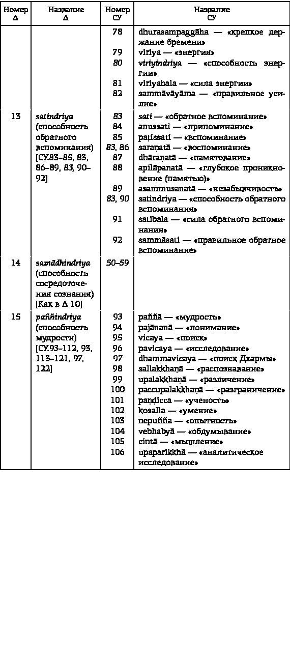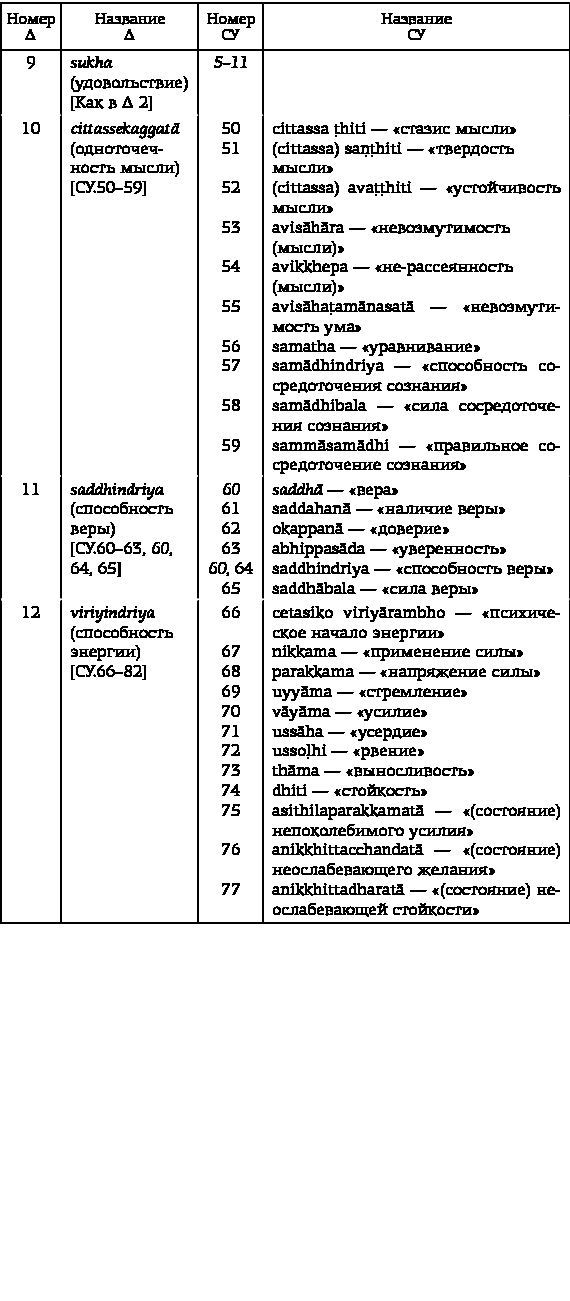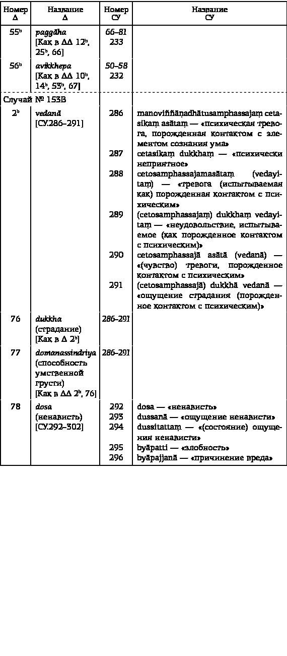 Переходя теперь к классу неопределенных дхарм (dhammā abyākatā), мы видим, как в уменьшенных наборах дхарм (ДД.17–26) семь вариантов дхармы мысли (ΔΔ 5a–5f и отдельно Δ 5) в своих соответственных группах состояний ума содержат термины М.3–9 номенклатуры мысли точно таким же образом, как мы видели в случае читты выше: «элемент сознания зрения» (cakkhuviññāṇadhātu) выступает как субъект возникновения мысли (М.3) и как особое состояние ума [Δ 5a (и Δ 16a); СУ.324]; «элемент сознания слуха» (sotaviññāṇadhātu, М.4) выступает в Δ 5b и Δ 16b как СУ.328; «элемент сознания обоняния» (ghānaviññāṇadhātu, М.5) – в Δ 5c (и Δ 16c) как СУ.332, и т. д.