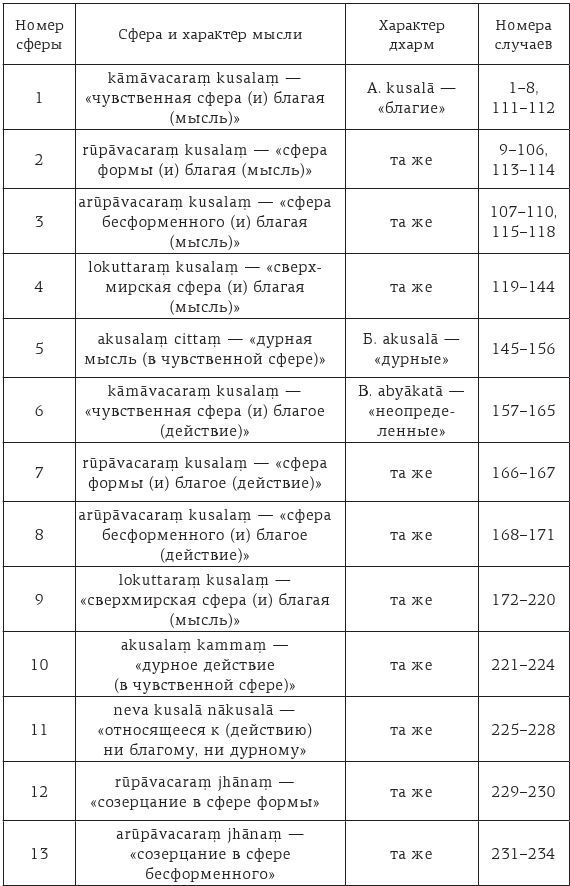 Из Таблицы XIV ясно видно, что только у восьми дхарм (ΔΔ 1–5, 10, 16, 18) топос не может оставаться пустым – не может быть такого случая (samaya), где бы всех их не было. Так что эти дхармы можно считать фундаментальными в отношении любого возникновения мысли из перечисленных в Дхс. Две из них, однако, – «контакт» и «способность жизни» (ΔΔ 1, 18) – можно считать самыми фундаментальными «точками» или даже «центрами» во всем «дхармическом пространстве» возникновения мысли. И не только потому, что они незаменимы и незаместимы, но, вероятно, также из-за их особой и удивительной функции: «контакт» и «способность жизни» можно рассматривать как два локуса, через которые одно возникновение мысли связывается с другим или переходит в него, образуя тем самым своего рода ось для континуума мысли (cittasantāna).