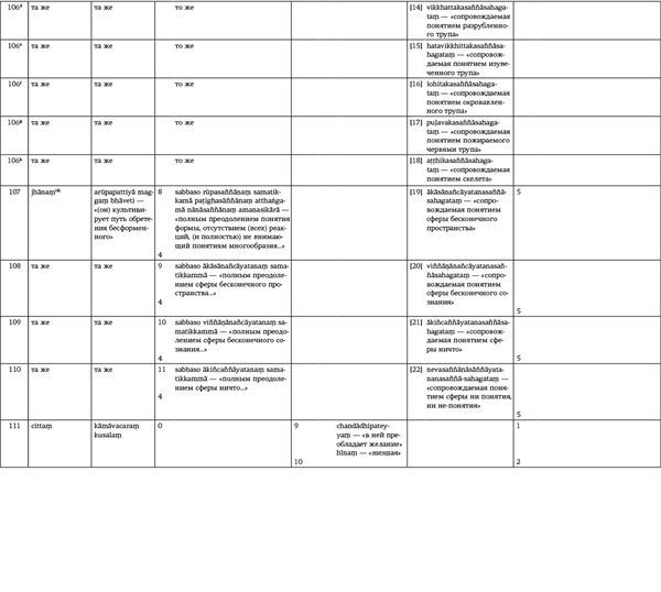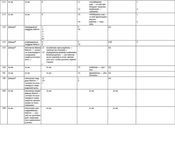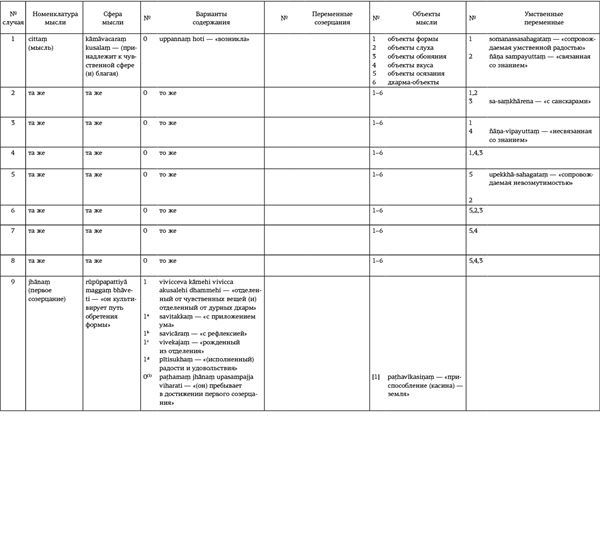 Чувствуя собственную неспособность ответить на этот вопрос, я бы сделал лишь два, так сказать, «ограничивающих замечания». Во-первых, о каждом шаге дхьянической прогрессии (то есть первое созерцание, второе, третье и т. д., первая стадия (bhūmi), вторая и т. д.) можно утверждать, что содержанием в каждом конкретном случае дхьяны является предыдущая мысль (предыдущая в смысле фаз йоги, а не прошлая в смысле внешнего по отношению к дхьяне времени), так что каждая «еще не трансформированная мысль» рассматривается (или, скорее, мыслится) как остаточная, а не действительная, тогда как «возникшая» мысль (как в № 1–8, например) всегда действительна. А потому «дурные состояния сознания» первой джханы могли означать именно дурные дхаммы (отмеченные как акусала в Таблице VI), и как таковые они могли относиться к предыдущей и благой мысли (citta) как ее дхармы. [Или можно даже предположить, что эти дхармы могли выступать в их «субъективной» функции «до и/или вместо» мысли (см. Таблицу IX).]