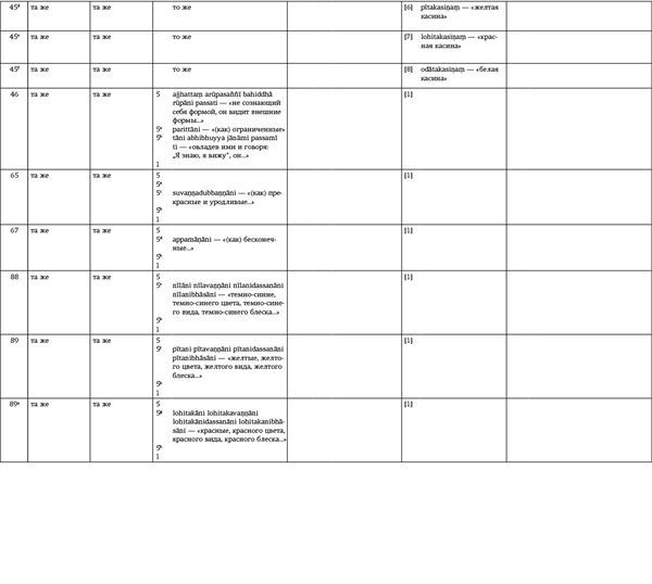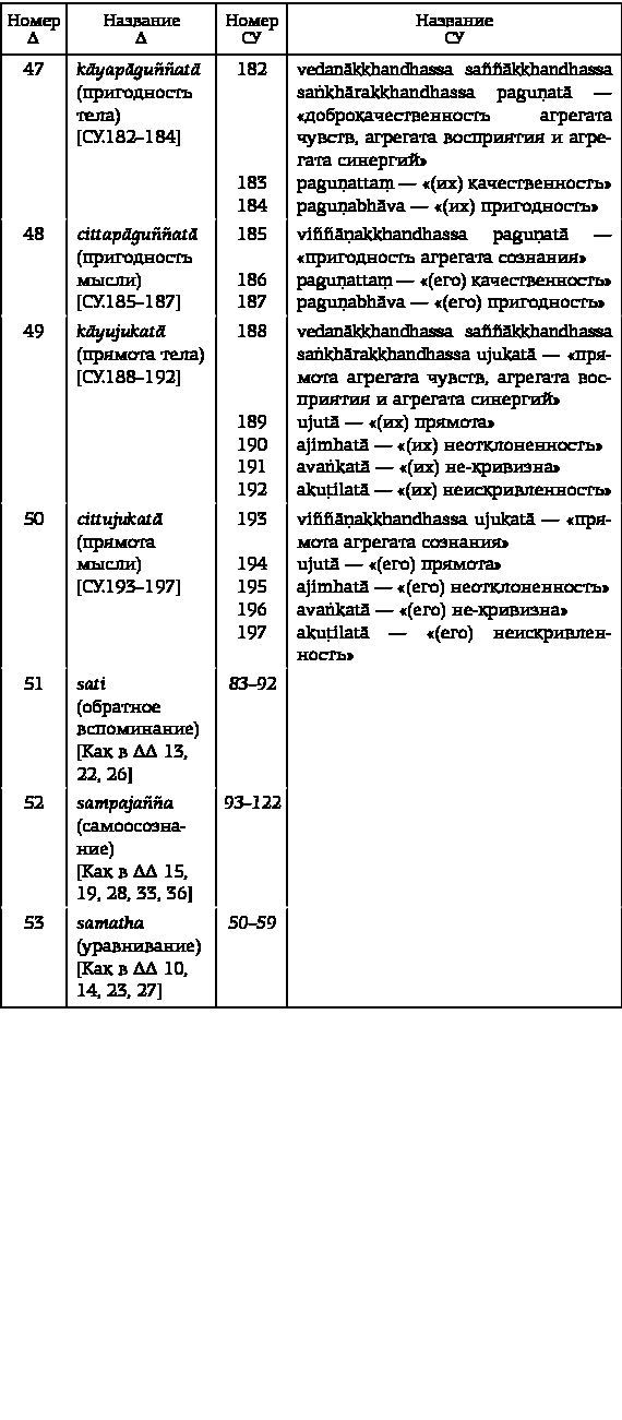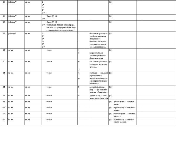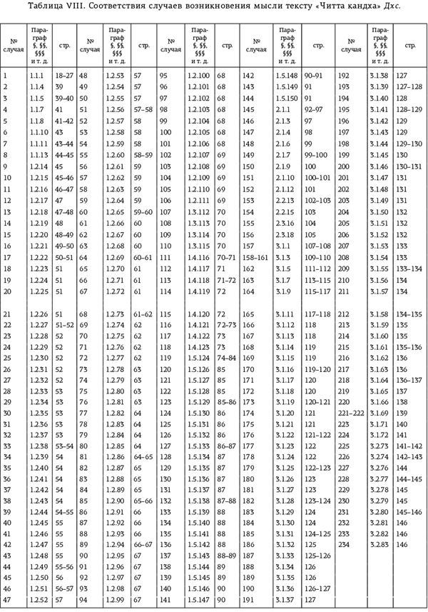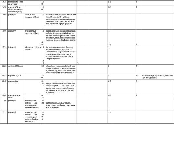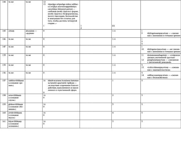 Второе наблюдение касается совсем другого деления объектов. Во всех случаях, связанных с неопределенными дхармами, мы наблюдаем сокращение числа объектов (в № 157–161 с шести до одного, в № 162 с шести до пяти и т. д.), что можно считать одной из самых распространенных черт почти всех видов йоги, хотя, технически говоря, эти случаи не были дхьяническими (если только они не сочетались с джханами, как в № 166–231). Более того, учитывая, что такие случаи связаны также с наборами дхарм с крайне сокращенным числом последних (с 61 в № 144 до 32 в № 145 и до 10 в № 157, см. Таблицу VII), можно предположить, что переход к Нирване связан с некой «тонкостью», «разреженностью» сознания (или даже с его «сжатостью»). Это может выражаться либо в сокращении числа (или «уплотнении») объектов, либо в сокращении числа дхарм, либо и в том и в другом.