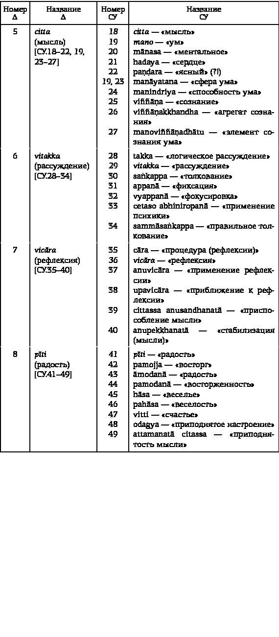 5.1.2. Совсем другое измерение мысли обнаруживается в большой группе терминов, обозначающих дхармы (ΔΔ, «состояния сознания») и дхармические коннотации (СУ, «состояния ума»). Это можно показать на следующем примере: Мысль (citta), «возникшая» в контексте «возникновения» № 1 (так называемая «первая мысль»), соотносится с набором из 56 дхарм (Д.1). Пятым состоянием сознания в этом наборе также является «мысль» (Δ 5, citta). Последняя, в свою очередь, подразумевает десять состояний ума (СУ.18–27), и первым из них опять-таки является «мысль» (СУ.18). Более того, в этом же самом наборе есть дхарма «способности ума» (Δ 16, manindriya), состав которой идентичен составу дхармы мысли, то есть он включает в себя точно такие же состояния ума (СУ.18–27). Так что пока у нас есть четыре «мысли», обозначенные тем же самым словом (citta) и отличающиеся лишь своими соответственными позициями в Таблице VI: «мысль как возникшая» (то есть как «субъект возникновения»), мысль как Δ 5, мысль как СУ.18 в Δ 5 и мысль как СУ.18 в Δ 16. [Таким образом, можно сказать, что один и тот же термин, читта, имеет четыре разных позиционных значения, ведь они и в самом деле разные.]