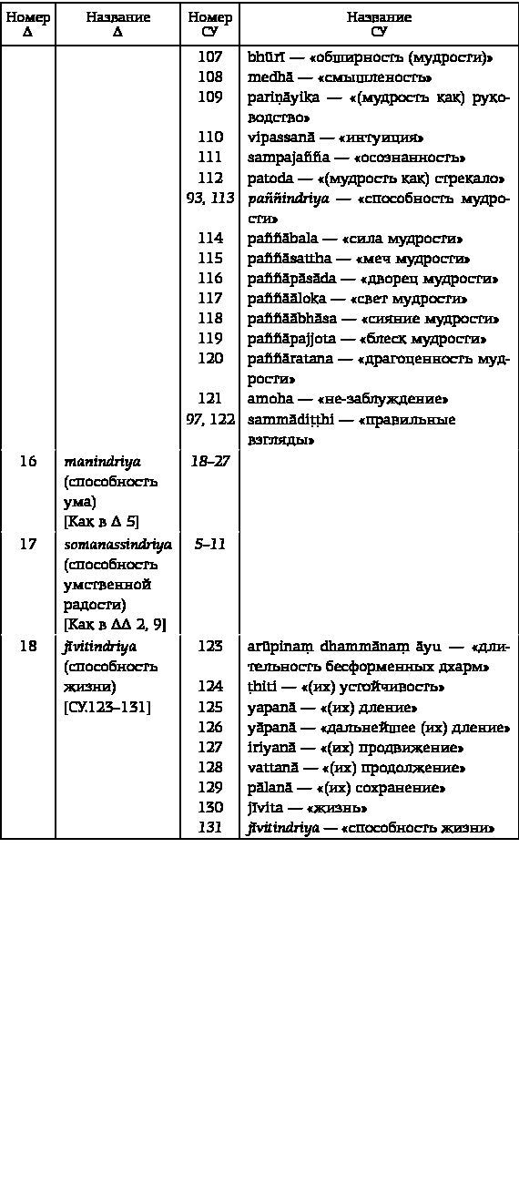 β. Синонимические дхармы, то есть обозначенные разными терминами, но при этом обладающие тем же набором состояний ума. Таковы, например, ΔΔ 5, 16 (то есть «мысль» и «способность ума», СУ.18–27). [Легко заметить, что вариант не может быть «синонимом» своего инварианта!]