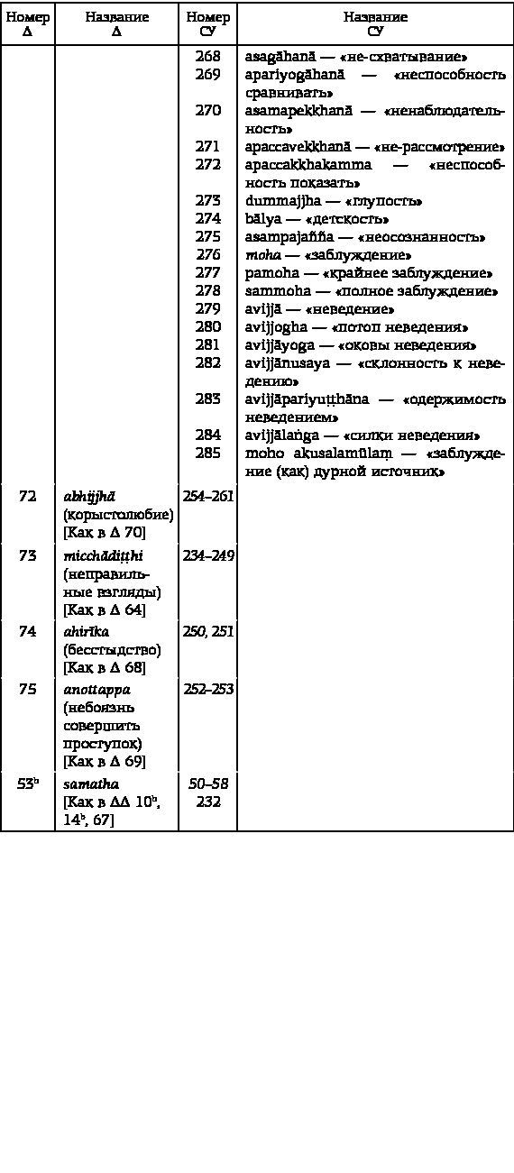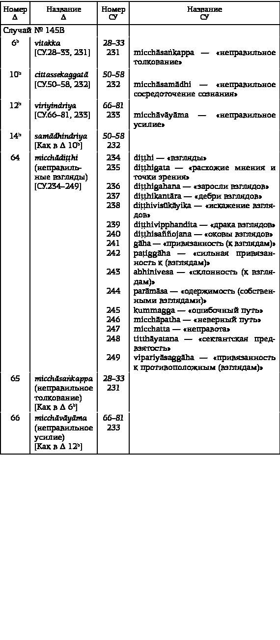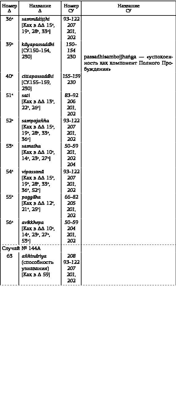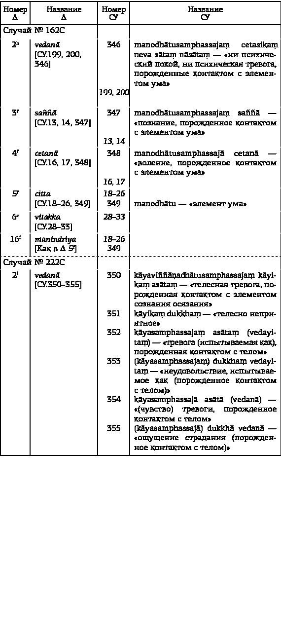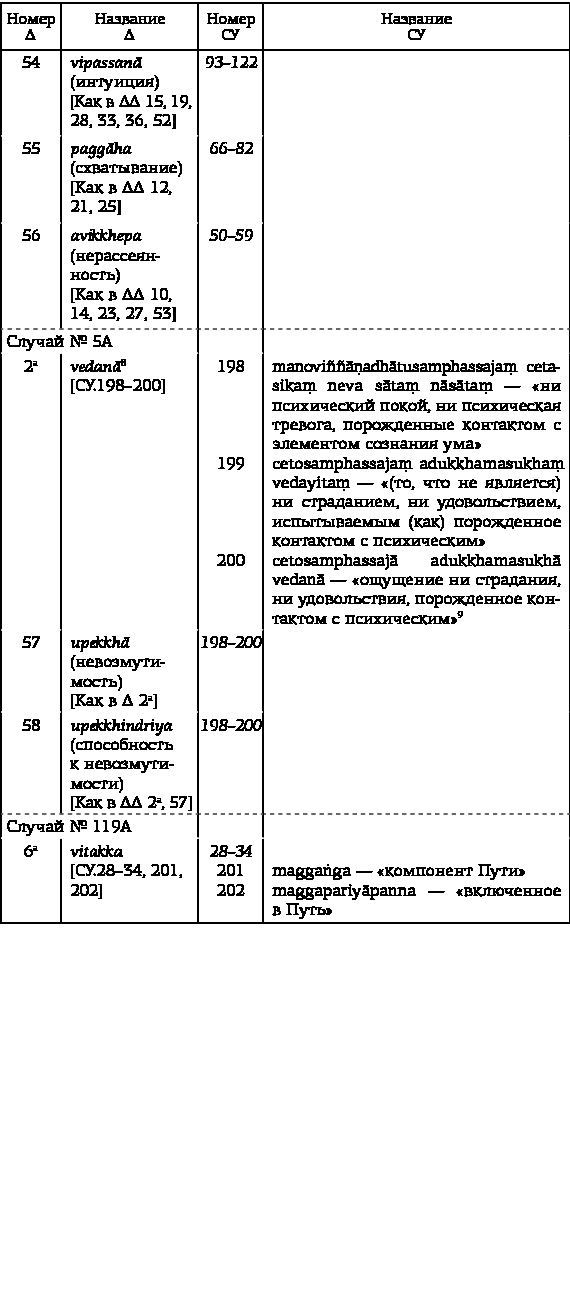 α. Омонимические дхармы, то есть обозначенные одним и тем же термином, например дхарма «правильных взглядов» (sammāditthi), которая дважды появляется в списке благих дхарм (ΔΔ 19, 36). Разумеется, сюда относятся все варианты дхарм, омонимические par excellence по отношению к их соответственным инвариантам. Например, Δ 2a – омоним Δ 2 (vedanā), хотя и обладает другим набором состояний ума (Δ 2 – СУ.5–11, Δ 2a – СУ.198–200), в то время как обе дхармы «правильных взглядов» обладают одним и тем же набором состояний ума (СУ.93–122).