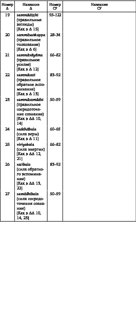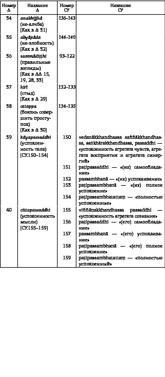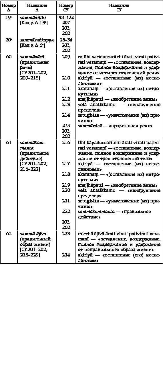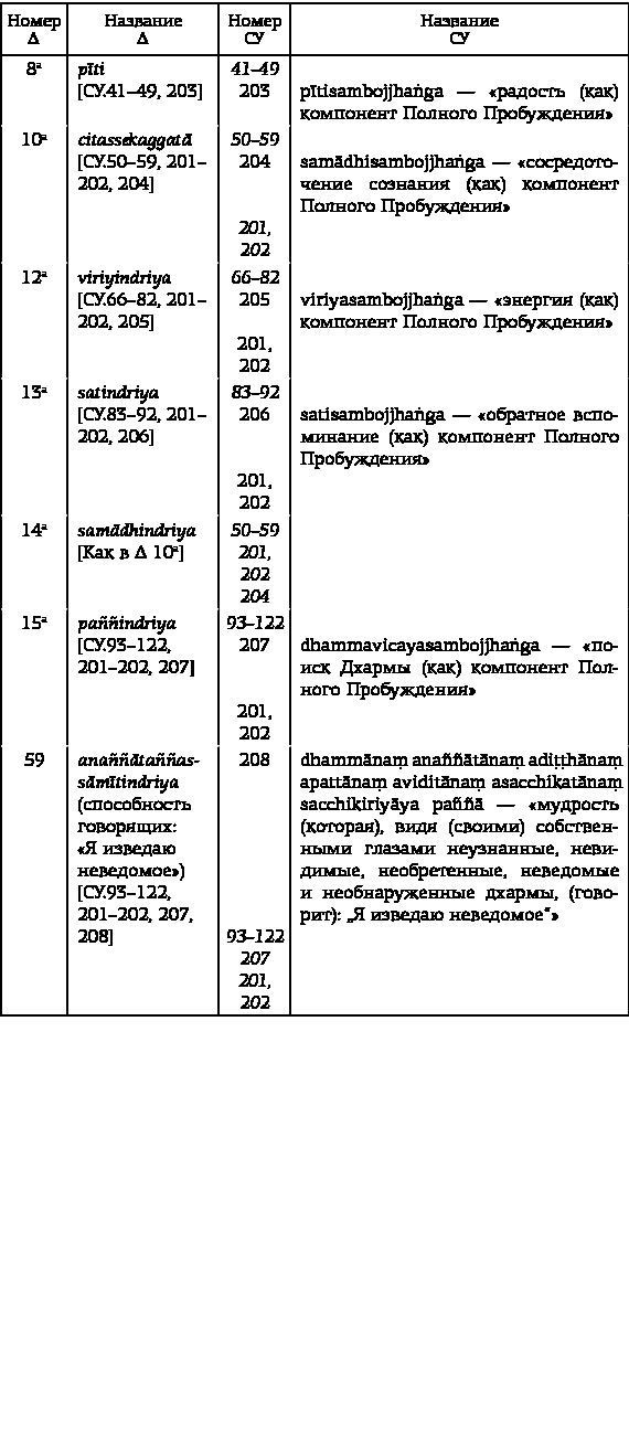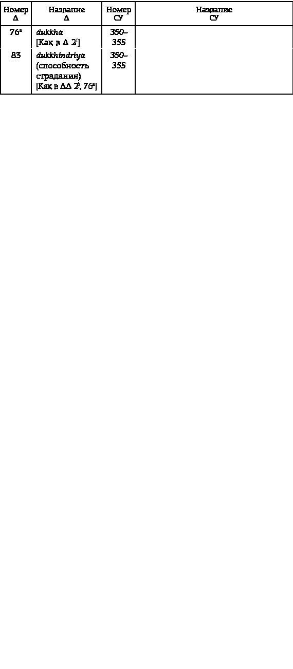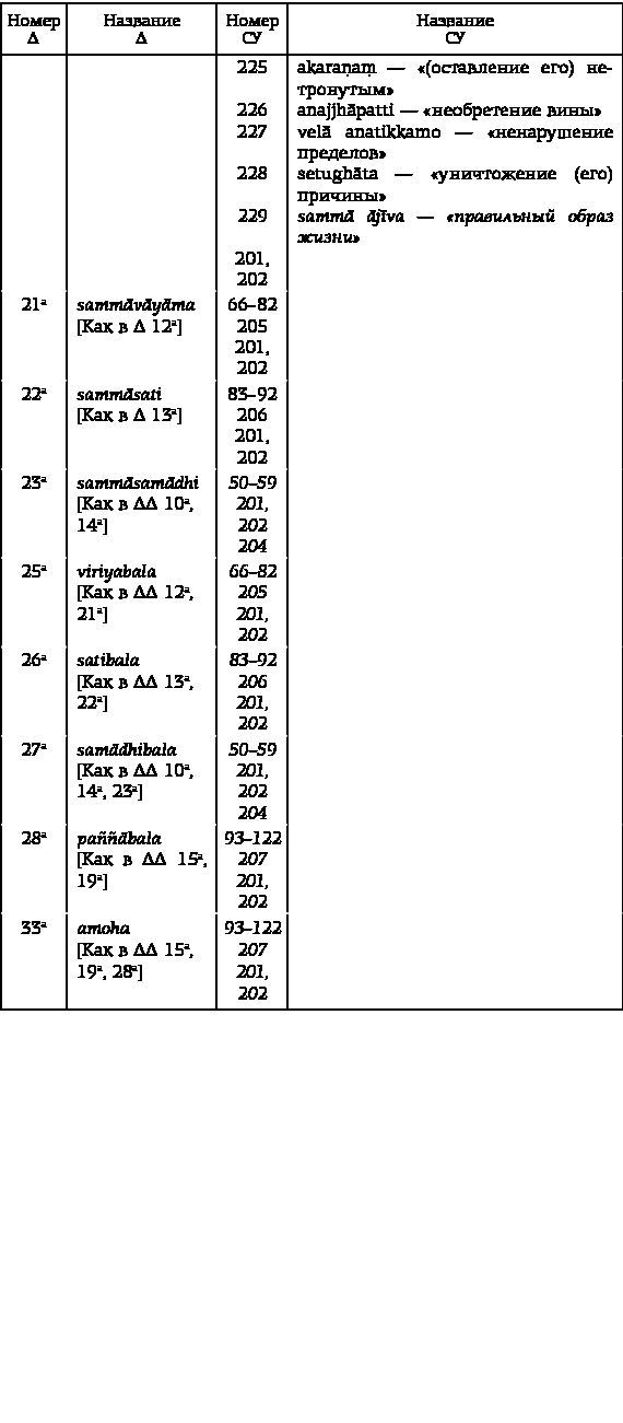 α. Омонимические дхармы, то есть обозначенные одним и тем же термином, например дхарма «правильных взглядов» (sammāditthi), которая дважды появляется в списке благих дхарм (ΔΔ 19, 36). Разумеется, сюда относятся все варианты дхарм, омонимические par excellence по отношению к их соответственным инвариантам. Например, Δ 2a – омоним Δ 2 (vedanā), хотя и обладает другим набором состояний ума (Δ 2 – СУ.5–11, Δ 2a – СУ.198–200), в то время как обе дхармы «правильных взглядов» обладают одним и тем же набором состояний ума (СУ.93–122).