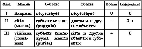 5.3.3. Сама формулировка «возникла» (uppannaṃ hoti) составляет минимум содержания мысли, и фактически это именно то, с чем мы имеем дело в первых восьми случаях возникновения мысли, названных в Дхс. «восемью мыслями». В этих случаях «мысль возникла» с такими объектами, как объекты чувств, а также дхармические объекты, сопровождаемая или не сопровождаемая и связанная или не связанная с пятью умственными переменными и связанная с некоторым количеством благих дхарм (от 56 до 49). Содержание мысли, однако, остается одинаковым во всех восьми случаях – «возникла». И его можно считать своего рода чистым содержанием, то есть содержанием мысли, которое ни осложнено йогическим процессом (как в дальнейших сотнях случаев), ни крайне урезано, как в случае связи с неопределенными дхармами. Эта неизменность минимума содержания свойственна тому, что можно назвать «нормальной мыслью», и она остается неизменной основой всех других содержаний, когда мысль, именуемая как citta, viññāṇa, manodhātu или manoviññāṇadhātu, не замещается состоянием созерцания (jhāna). Хотя даже в последнем случае, когда созерцание намеренно и сознательно вырабатывается, вызывается или достигается (то есть upasampanna вместо, так сказать, uppanna), форма этого основного содержания остается той же самой во всех вариантах и комбинациях вариантов содержания дхьянической мысли. Мы можем говорить об этом «минимуме содержания» как о «нулевом содержании» мысли и считать его «бессодержательным ядром» каждой мысли – фактом как бы фиксации ее становления.