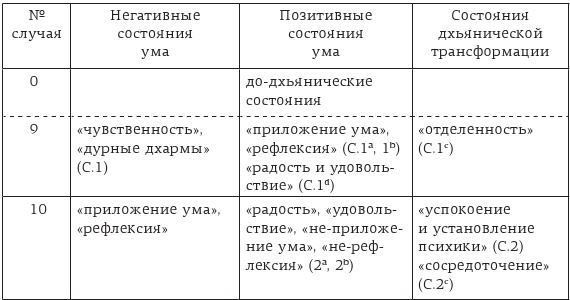 Таблица X. Дхьянические трансформации состояний ума в содержании четырех созерцаний