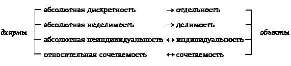 Вместе с тем, если вернуться к строго метафилософской позиции в вопросе связи «объект – дхарма», то мы увидим, что ни «объект», ни дхарму нельзя даже приблизительно понимать в качестве «феномена». Это обусловлено не только их гипостазированностью a priori, но в первую очередь самим фактом того, что тип общей связи, зафиксированной в понятии дхармы, как бы «методологически» отражен в типе общей связи, зафиксированной в понятии объекта (ālambana, ārammana). То есть, так сказать, в обоих имеется связанная с чем угодно мысль и т. д., но в дхарме эта связь устанавливается до всякого актуального мышления (или, скажем, до всякого наблюдаемого факта мышления), тогда как в объекте мысль рассматривается как занимающаяся уже всеми «объектами», включая все дхармы. Поэтому «методологически» здесь не подразумевает эпистемологии, ведь мы просто предпочли рассматривать дхармы с точки зрения объектов, тогда как вполне могли бы делать это и наоборот. А именно, когда сама связь («мысль – объект») рассматривалась бы как реализуемая объективно внутри той или иной дхармы, то есть независимо от того, познают ли ее, а если познают, то как.