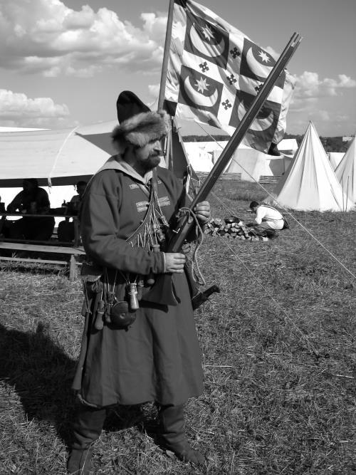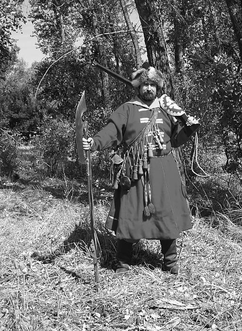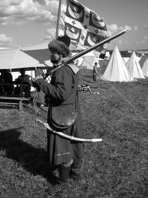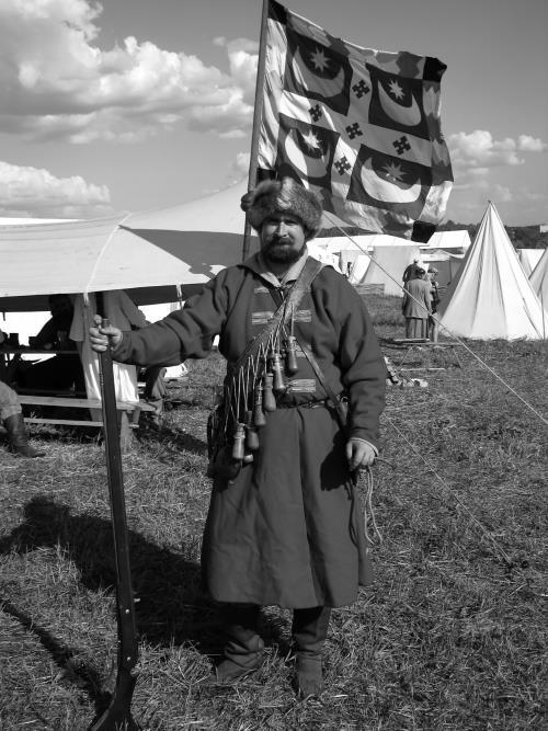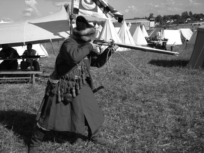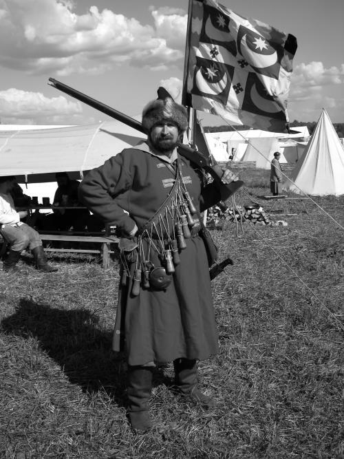 Московский стрелец 60-70-х гг. XVII в. Боевой/походный вариант (штатное вооружение – бердыш, мушкет, снаряжение для стрельбы. Замок мушкета закрыт суконным цветным полунагалищем (лопастью, предохраняющей полку замка от пыли и воды). Фото и реконструкция автора.