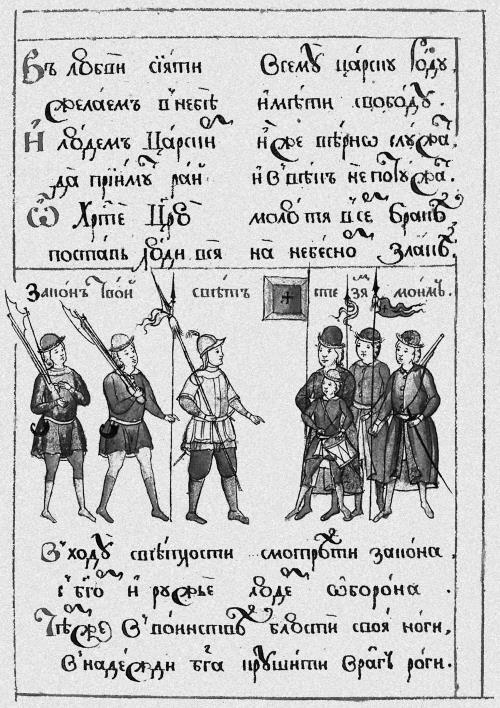 Московские стрельцы на рисунках из эпиталамы Кариона Истомина «Книга любви знак в честен брак». Единственный изобразительный источник, позволяющий увидеть московских стрельцов конца 70-х – середины 80-х гг. XVII в. (Истомин Карион. Книга любви знак в честен брак. М, 1989. Листы 10, 11, 17.)