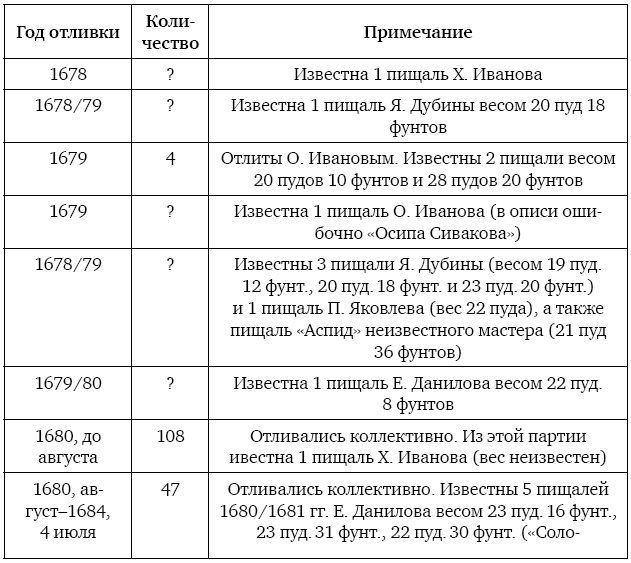 В 1661 г. начались массовые отливки полковых однотипных орудий, которые продолжались почти 40 лет. Конструкционные особенности новых полковых пушек отвечали тогдашним требованиям ведения полевого боя. Небольшой калибр в 2 фунта и длинный, почти 2,5 м, ствол обеспечивали достаточно точную и дальнобойную стрельбу ядрами и цепными снарядами задолго до огневого соприкосновения противника. Очевидно, что орудия прекрасно себя зарекомендовали в войнах 1660–1680 гг., поэтому от их производства не отказывались вплоть до конца XVII в. На основе архивных источников мной была составлена таблица производства двухфунтовых орудий (впервые включена в диссертацию в 2004 г. и опубликована в том же году). В 2012 г. она была вновь опубликована с уточнениями. За минувшее время обнаружились новые материалы, которые и включены в настоящую работу. Фактов отливки однотипных пищалей за 36 лет (1662–1698 гг.) было обнаружено более сорока. В 19 случаях «серийного» производства количество отлитых орудий составляет почти 600 штук. В 24 случаях нам неизвестно число сделанных орудий, но если даже предположить, что в каждом случае было отлито около 2-10 штук (мастер никогда не отливал полковые пищали по 1 экземпляру), то даже самый минимальный подсчет показывает общее количество отлитых орудий с 1662 по 1698 г. почти 800 штук. Ранее, в книге «Пушки первых Романовых», я приводил сводную таблицу по производству 2-фунтовых полковых пищалей с 1661 по 1677 г.