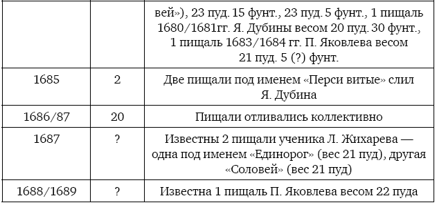 Известен случай, когда на следующий год после свержения Софьи Алексеевны 7 апреля 1690 г. под руководством пушкарского головы В. Долматова было отлито 10 пищалей калибром в 1 гривенку, длиной по 1,5–2 аршина. Производство такие мелких орудий было эпизодическими случаями.