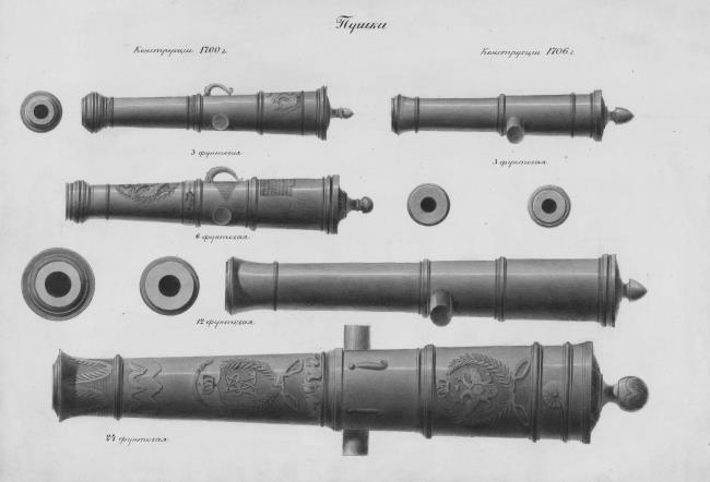 Если реформы по единообразию полковой артиллерии активно внедрялись со времен первых Романовых, то настоящим прорывом в Петровское время стала унификация средней и тяжелой артиллерии с 1701 г., т. е. после Нарвы 1700 г. Тогда были определены калибры для бронзовых пушек (3, 6, 12, 18, 24 фунтов), гаубиц (V 1 пуд), для мортир (0,5,1, 2, 3 пуда).