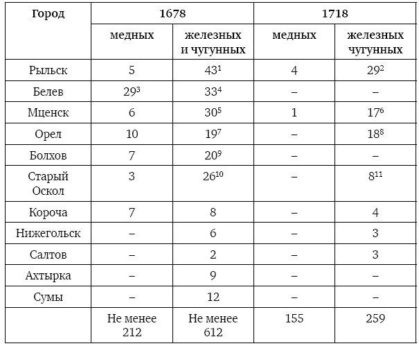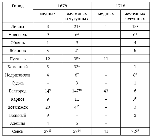 За 40 лет (1678–1718 гг.) мы видим по городам значительное сокращение не только медных, но и железных (чугунных) орудий. Данные для примера даны только по южным крепостям. Города в Центральной России вообще практически лишились какого-то ни было артиллерийского вооружения.