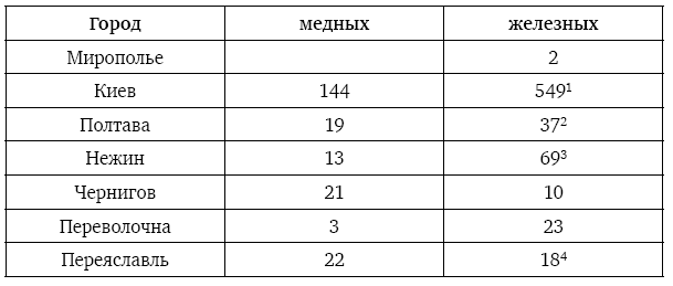 В городах Украины к 1718 г. было достаточно большое количество медных и чугунных (железных) орудий, однако сравнить изменения по сравнению с XVII столетием не представляется возможным ввиду отсутствия данных (кроме г. Киева):
