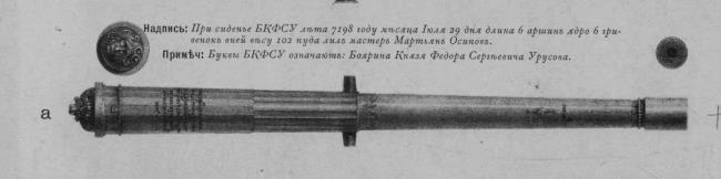 Вообще, в 1690-е гг. в надписях часто стали использоваться аббревиатуры. БКФСУ раскрывается как «боярина князя Федора Семеновича Урусова». В настоящее время орудие экспонируется в Московском Кремле (Инв. 25621 охр Арт-732/1). Средняя и дульная части ствола гладкие. Ствол не имеет дельфинов, пояса присутствуют на концах казенной и дульной частей. На конце дула имеется набалдашник, что внешне напоминает орудие 1520–1530 гг., и рельефное изображение райской птицы с надписью «Гамаюн». На плоской торели отлита львиная голова с отверстием в пасти для кольца.
