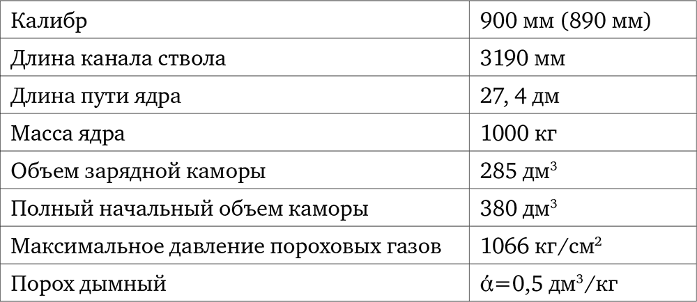 Состав дымного пороха и его характеристики М.Г. Захариков взял из трактата делль’Аквы (1630–1635 гг.). Специалист пришел к выводу, что при массе ядра в 750 кг, пороховом заряде в 84 кг дульная скорость ядра составляла около 230 м/с. Сам ствол вполне мог выдержать выстрел гигантским снарядом.