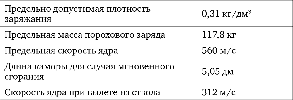 По расчетам, Царь-пушка могла выдержать стрельбу гигантскими каменными ядрами (1000 кг ядро, заряд пороха 117,8 кг, предельное давление при плотности заряжания менее 0,4×103 кг/м3 = 1066,32 кг/см2).